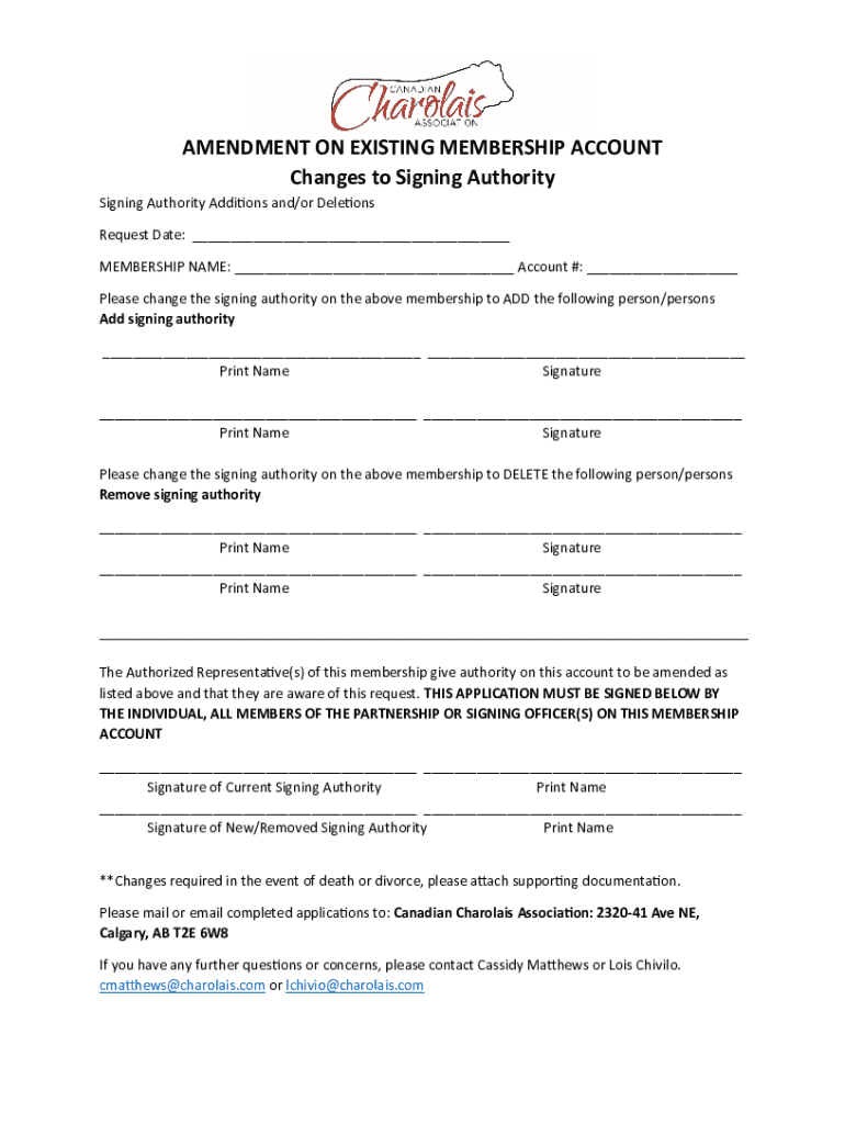 AMENDMENT ON EXISTING MEMBERSHIP ACCOUNT Changes to Signing AuthoritySigning Authority Addions and/or DeleonsRequest Date: ___ MEMBERSHIP NAME: ___ Account #: ___ Please change the signing authority