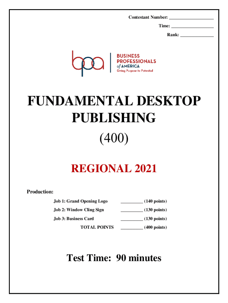 Contestant Number: ___ Time: ___ Rank: ___FUNDAMENTAL DESKTOP PUBLISHING (400) REGIONAL 2021 Production: Job 1: Grand Opening Logo___ (140 points)Job 2: Window Cling Sign___ (130 points)Job 3: Business