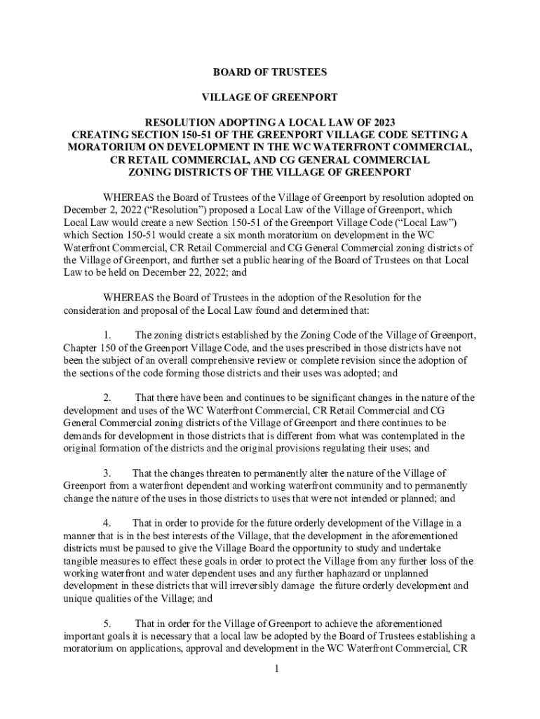 BOARD OF TRUSTEES VILLAGE OF GREENPORT RESOLUTION ADOPTING A LOCAL LAW OF 2023 CREATING SECTION 15051 OF THE GREENPORT VILLAGE CODE SETTING A MORATORIUM ON DEVELOPMENT IN THE WC WATERFRONT COMMERCIAL,