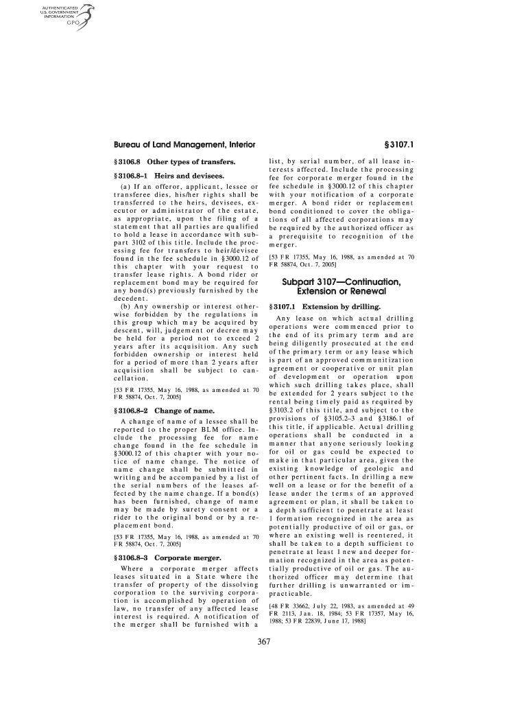 Bureau of Land Management, Interior 3106.8 3107.1 Other types of transfers. 3106.8 1 Heirs and devises. (a) If an offer or, applicant, lessee or transferee dies, his/her rights shall be transferred