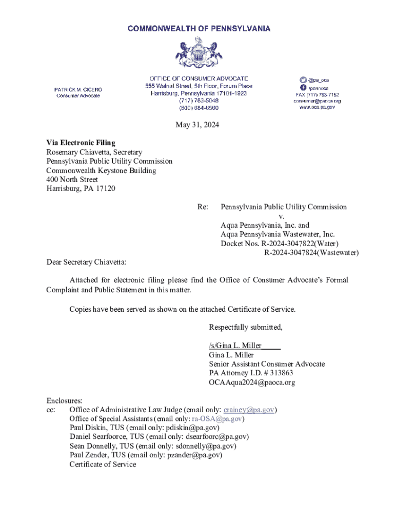 May 31, 2024 Via Electronic Filing Rosemary Chiavetta, Secretary Pennsylvania Public Utility Commission Commonwealth Keystone Building 400 North Street Harrisburg, PA 17120 Re:Dear Secretary Chiavetta:Pennsylvania