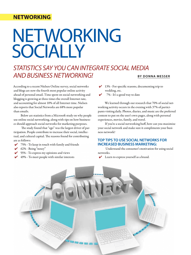 Networking Socially Statistics say you can integrate social media By Donna M lesser and business networking! According to a recent Nielsen Online survey, social networks and blogs are now the fourth