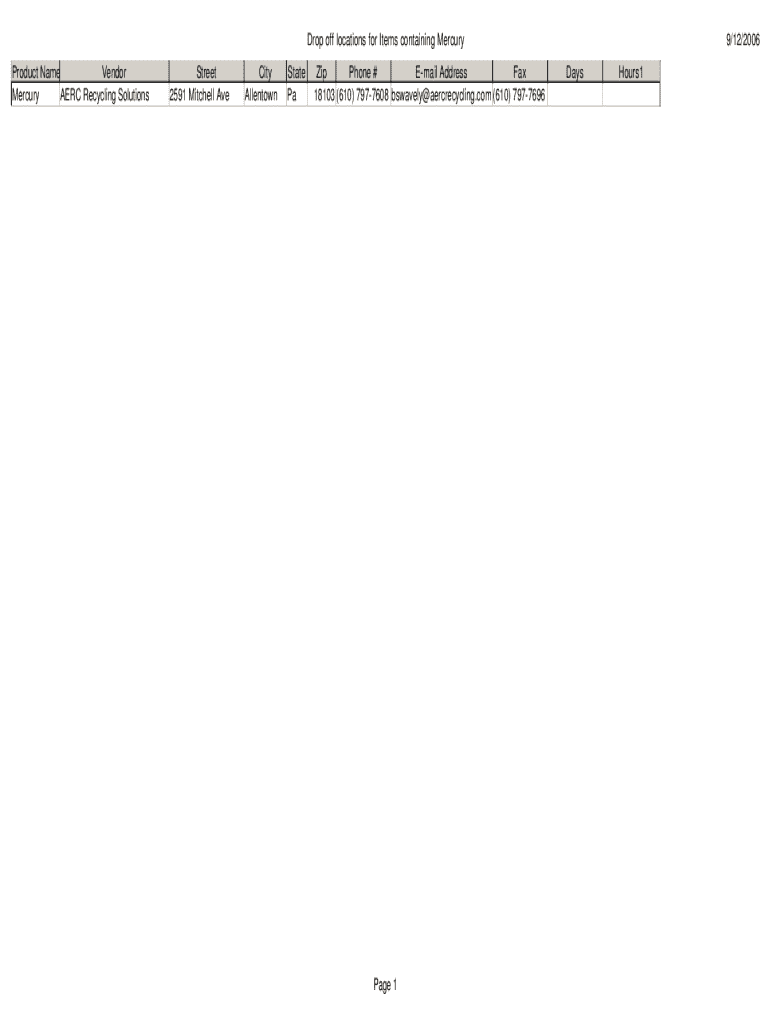 Drop off locations for Items containing Mercury Product Name Vendor Mercury AERC Recycling SolutionsStreet 2591 Mitchell AveCity AllentownState PaZip Phone # Email Address Fax 18103 (610) 7977608