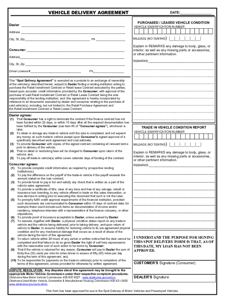 VEHICLE DELIVERY AGREEMENT Dealer ___DATE:___ PURCHASED / LEASED VEHICLE CONDITIONVEHICLE IDENTIFICATION NUMBER REPORTAddress ___ City, St, Zip___ Ph ___MILEAGE (NO TENTHS)Consumer ___Explain in REMARKS