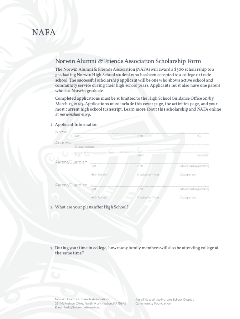 This form is for applicants seeking a $500 scholarship from the Norwin Alumni & Friends Association (NAFA). The scholarship is awarded to graduating Norwin High School students who have been accepted to a college or trade school and demonstrate active involvement in school and community services. Applicants must have a parent who is a Norwin graduate and must submit their applications by March 17, 2023.