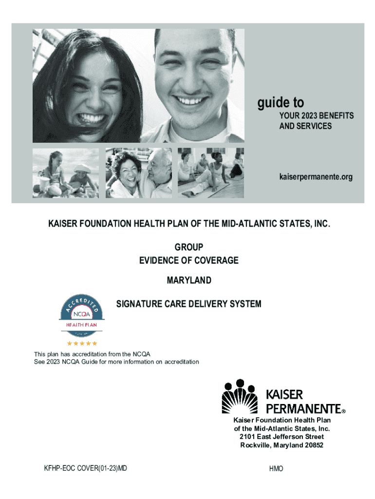 This document provides a comprehensive overview of the Kaiser Permanente health benefits and services for members in the Mid-Atlantic States. It includes details about eligibility, coverage options, rights and responsibilities, benefits exclusions, limitations, and claims processing. Members are encouraged to review it for specific details related to their health care services and coverage.