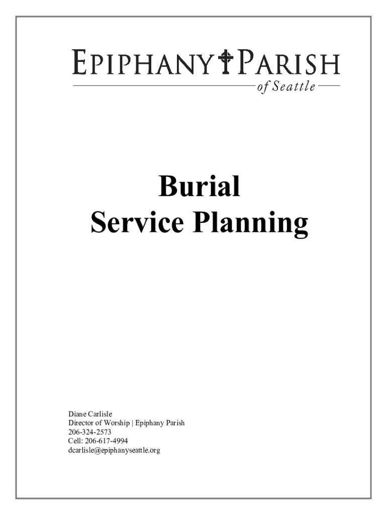 This document provides a comprehensive framework for planning a burial service at Epiphany Parish, detailing essential information about the deceased, preferences for the service, and logistical considerations including hymns, readings, and special requests.