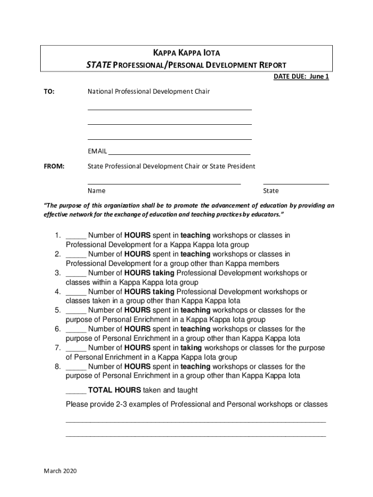 This document serves as a report for the Kappa Kappa Iota organization, detailing the hours spent in professional and personal development workshops or classes both within and outside the group. It aims to facilitate the exchange of teaching practices and promote educational advancement among educators.
