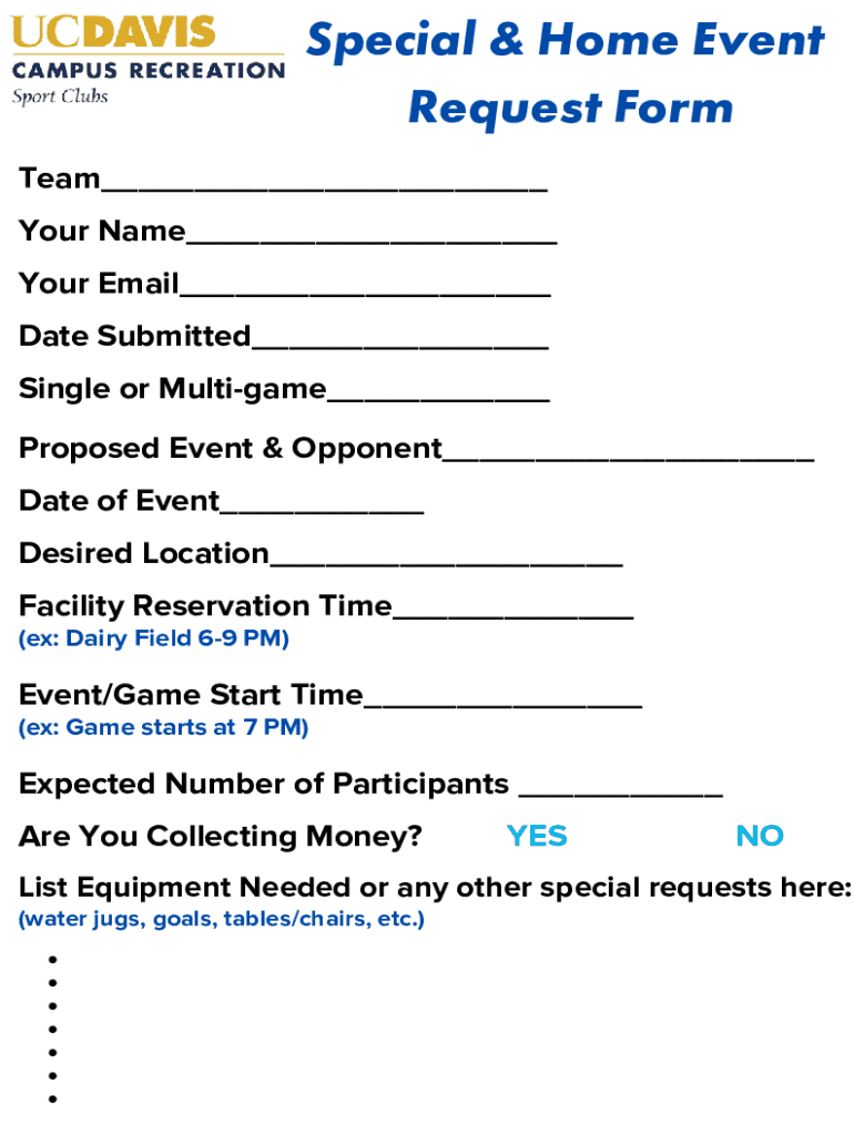 Special & Home Event Request Form Team___ Your Name___ Your Email___ Date Submitted___ Single or Multigame___ Proposed Event & Opponent___ Date of Event___ Desired Location___ Facility Reservation