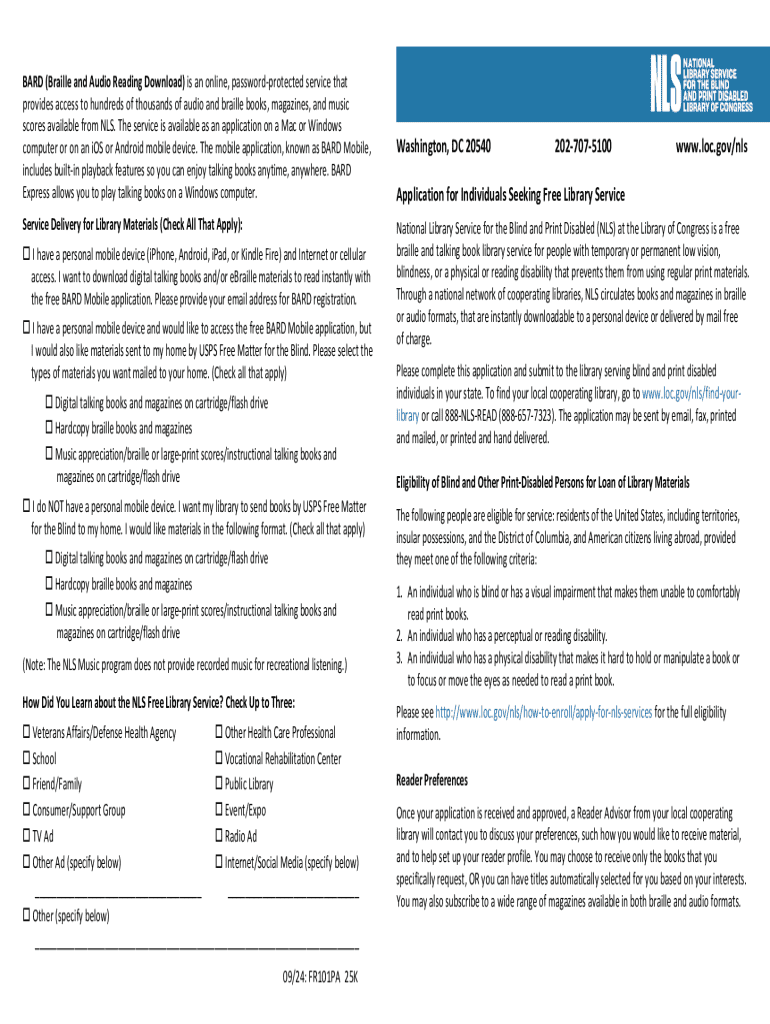 This application allows individuals with low vision, blindness, or reading disabilities to access the free braille and talking book library service provided by the National Library Service (NLS). Users can download materials via the BARD service or receive them by mail. The application collects personal details and eligibility criteria for service access.