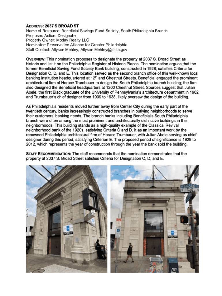 This document serves as a nomination for the Beneficial Savings Fund Society located at 2037 South Broad Street, Philadelphia, PA, to be recognized in the Philadelphia Register of Historic Places. It provides comprehensive details about the property\'s historical significance, architectural characteristics, and the criteria it meets for designation.
