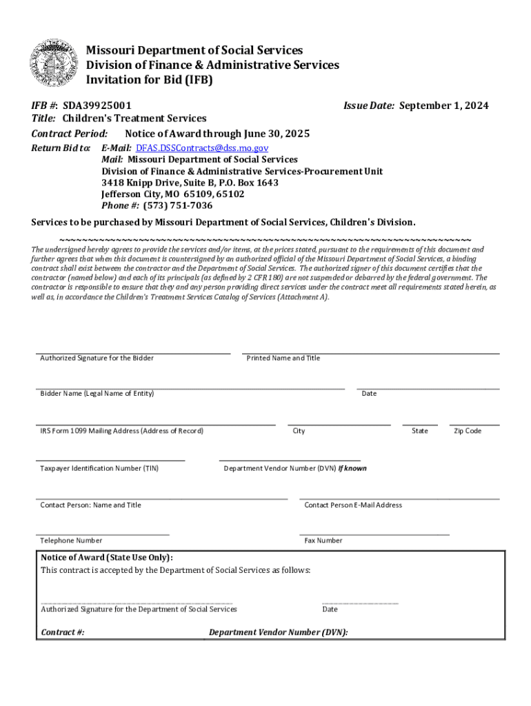 Missouri Department of Social Services Division of Finance & Administrative Services Invitation for Bid (IFB) IFB #: SDA39925001 Title: Children\'s Treatment Services Contract Period: Notice of Award