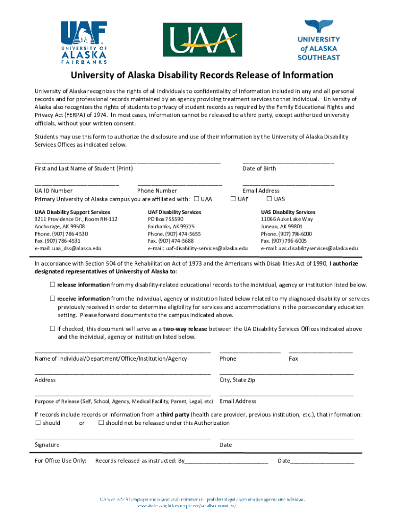 This document allows students at the University of Alaska to authorize the release and sharing of their disability-related educational records. It ensures compliance with privacy laws such as FERPA and is essential for students seeking accommodations or services related to their diagnosed disabilities.