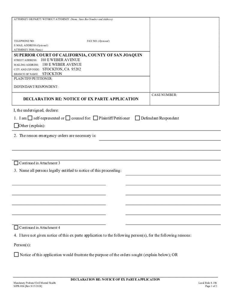 This document is used to declare the necessity of emergency orders in an ex parte application within the jurisdiction of the Superior Court of California, County of San Joaquin. It outlines the required notifications to parties involved and the justification for any failure to provide notice.