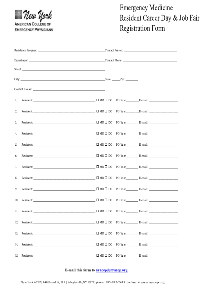 This form is used for registering residents for the Emergency Medicine Career Day and Job Fair, providing details such as residency program, contact person, department, and participant information.