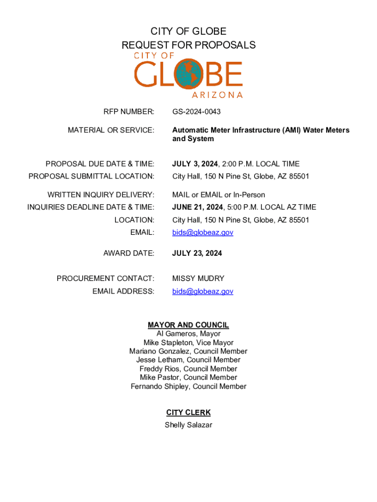 The City of Globe is seeking proposals for the supply and installation of Automatic Meter Infrastructure (AMI) Water Meters and an associated AMI System. This project aims to enhance the operational efficiency of the city’s water distribution system and promote water conservation through advanced metering technology. Proposals are due by July 3, 2024, and should address detailed specifications, qualifications, and pricing for the required services.