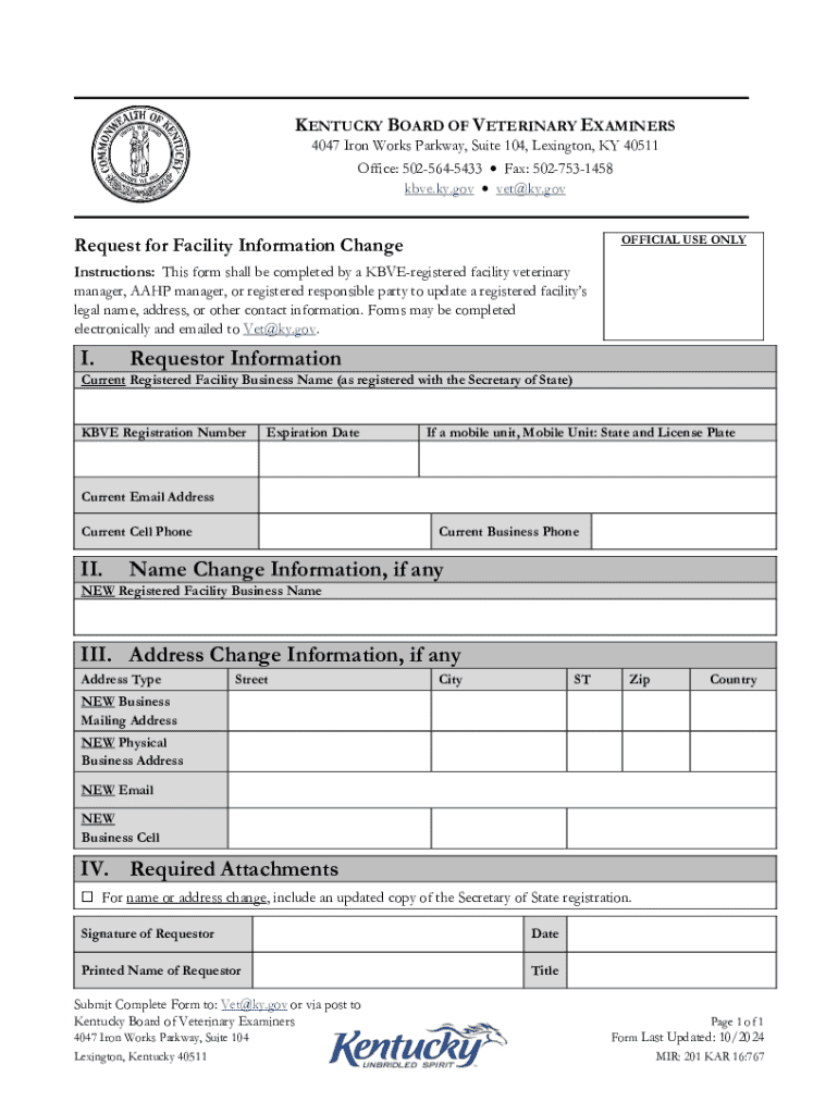 This form is used by registered veterinary facilities in Kentucky to update their legal name, address, or other contact information with the Kentucky Board of Veterinary Examiners. It must be completed by a facility veterinary manager or responsible party and submitted electronically or via post.