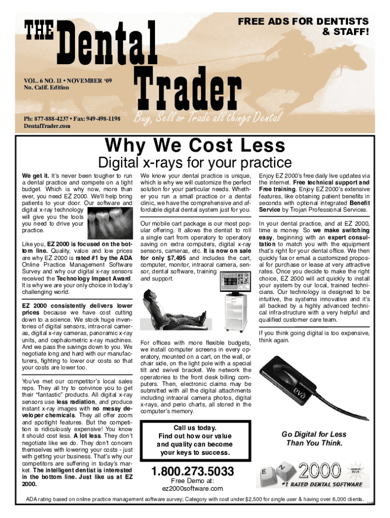 A comprehensive publication providing listings for buying, selling, or trading dental equipment and practices. Features various advertisements for dental services, equipment sales, and practice sales, with a focus on connecting dental professionals.