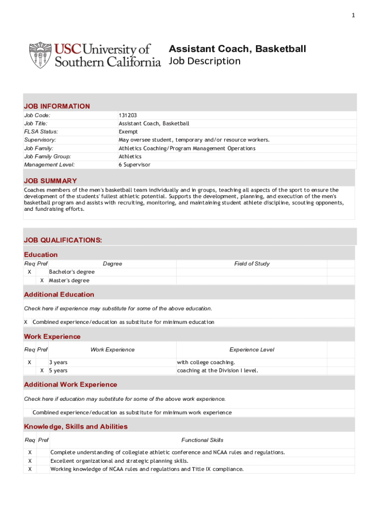 1Assistant Coach, BasketballJob DescriptionJOB INFORMATION Job Code:131203Job Title:Assistant Coach, BasketballFLSA Status:ExemptSupervisory:May oversee student, temporary and/or resource workers.Job