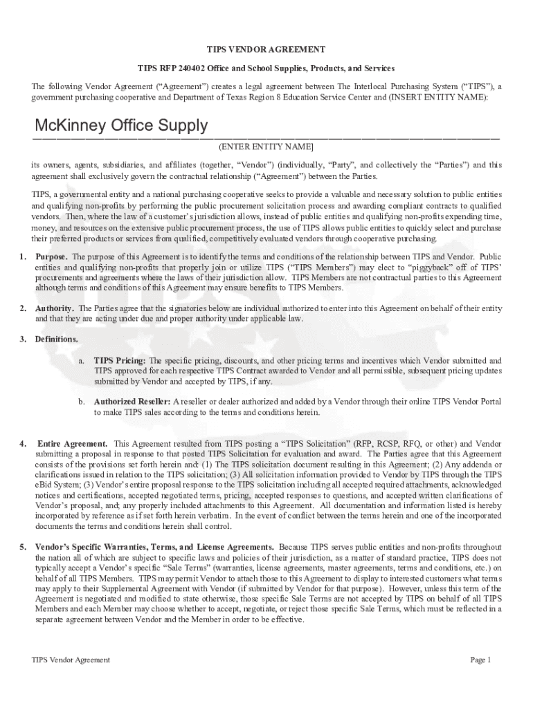 TIPS VENDOR AGREEMENT TIPS RFP 240402 Office and School Supplies, Products, and Services The following Vendor Agreement (Agreement) creates a legal agreement between The Interlocal Purchasing System