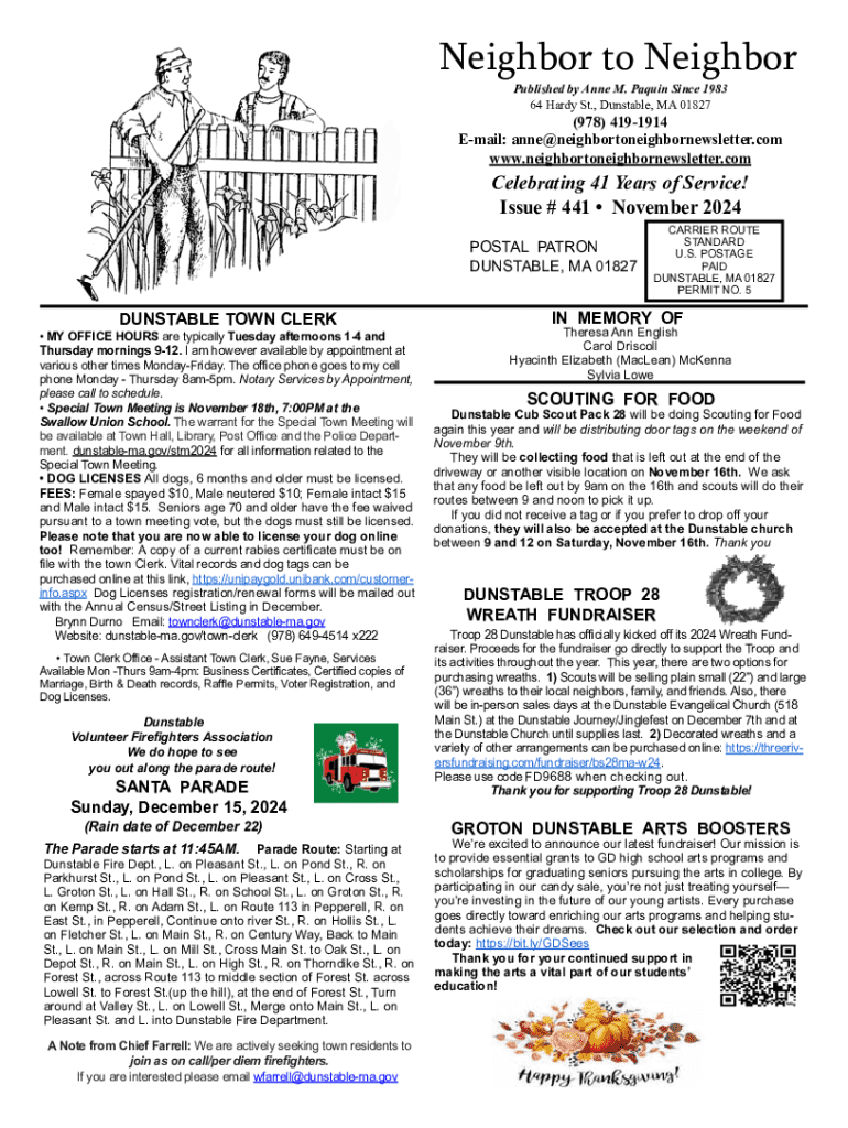 The Neighbor to Neighbor newsletter provides updates and information about community events, services, and local government activities in Dunstable and surrounding areas. This issue covers town meeting information, upcoming parades, dog licensing, holiday events, and resources for residents.
