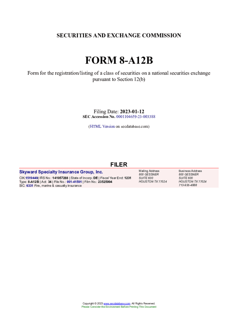 This document is a registration statement for Skyward Specialty Insurance Group, Inc. to register its common stock on the Nasdaq Global Select Market according to Section 12(b) of the Securities Exchange Act of 1934. It includes details about the securities being registered, the company’s incorporation details, and other regulatory requirements.