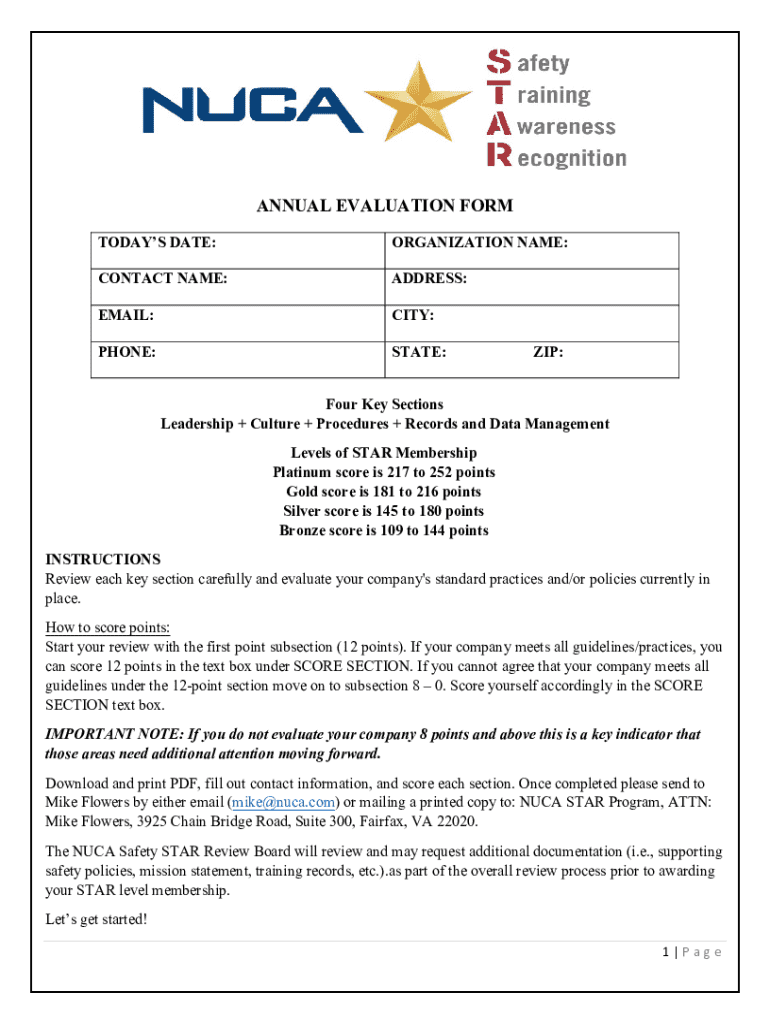 This document serves as a comprehensive annual evaluation form designed to assess the safety practices and policies of organizations participating in the NUCA STAR program. It provides a structured scoring system across various key sections related to leadership, culture, procedures, and records management, guiding companies to enhance their safety standards and achieve membership levels within the STAR program.