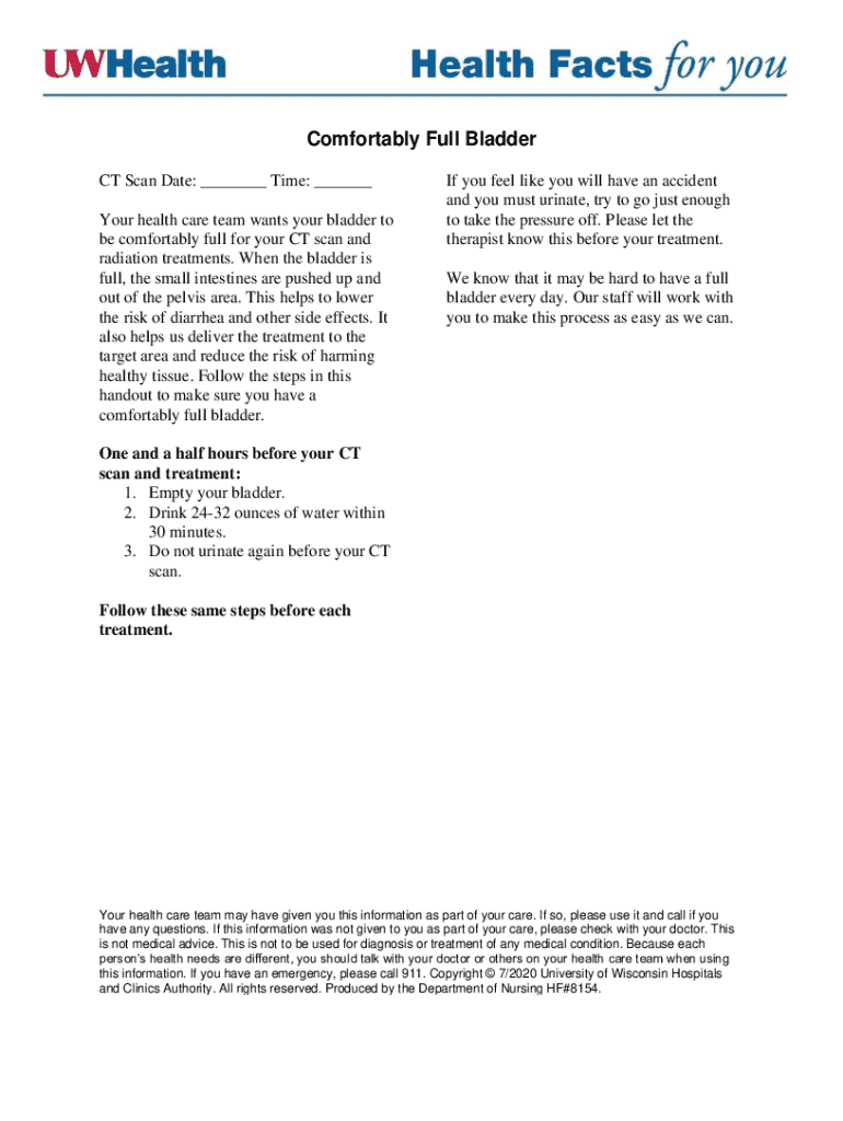 Comfortably Full Bladder CT Scan Date: ___ Time: ___ Your health care team wants your bladder to be comfortably full for your CT scan and radiation treatments. When the bladder is full, the small
