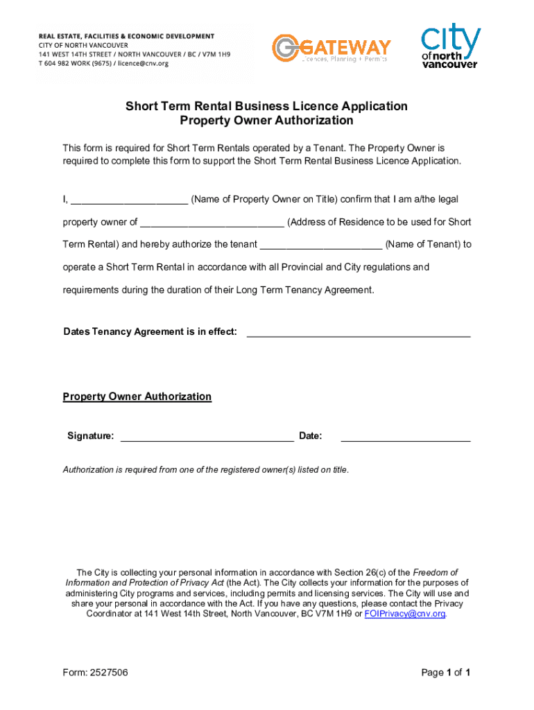 Short Term Rental Business Licence Application Property Owner Authorization This form is required for Short Term Rentals operated by a Tenant. The Property Owner is required to complete this form