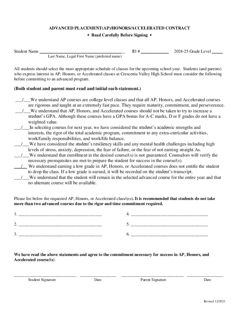 ADVANCED PLACEMENT(AP)/HONORS/ACCELERATED CONTRACT Read Carefully Before Signing Student Name ___ID # ___202425 Grade Level ___Last Name, Legal First Name (preferred name)All students should select