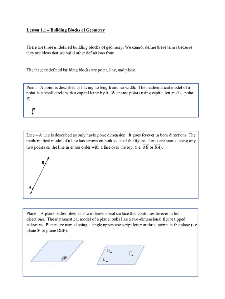 Lesson 1.1 Building Blocks of GeometryThere are three undefined building blocks of geometry. We cannot define these terms because they are ideas that we build other definitions from.The three undefined building blocks are point, line, and plane.Point A point is described as having no length and no width. The mathematical model of a point is a small circle with a capital letter by it. We name points using capital letters (i.e. point P)Line A line is described as only having one dimension