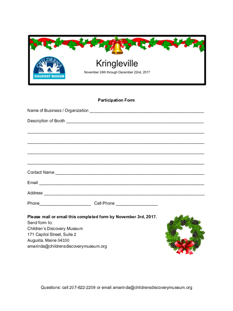 This form is used for businesses and organizations to register and provide details about their booth for an event at the Children\'s Discovery Museum. It collects contact information and requires a submission by a specific deadline.