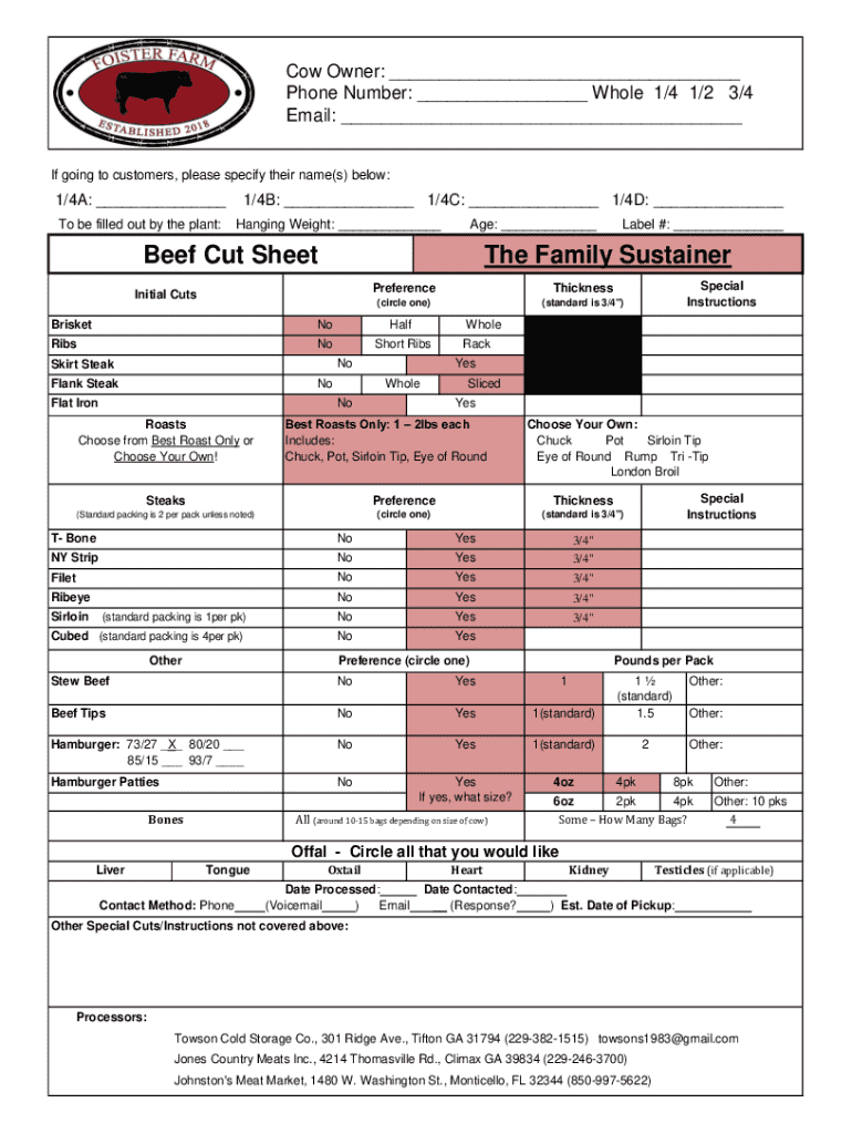 This document is a beef cut sheet used by cow owners to specify their preferences for meat cuts, weights, and processing instructions. It includes sections for initial cuts, thickness preferences, and additional instructions regarding packaging and special cuts. It also lists contact information for processing plants.