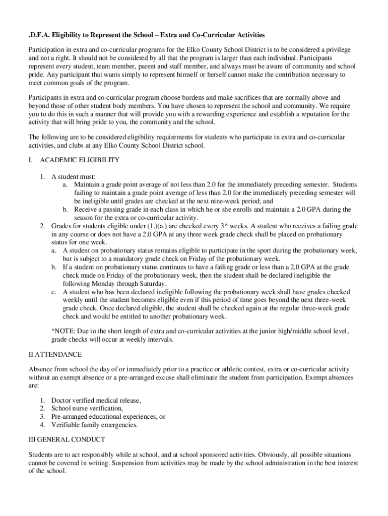 .D.F.A. Eligibility to Represent the School Extra and CoCurricular Activities Participation in extra and cocurricular programs for the Elko County School District is to be considered a privilege and