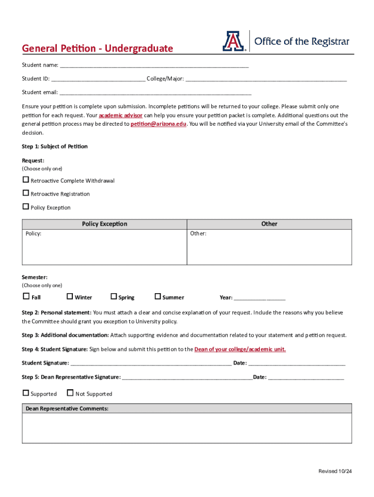 Get the free General Petition Form - Undergraduate - registrar arizona