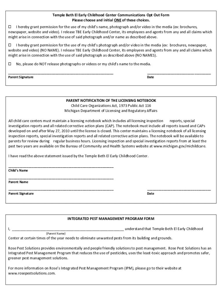 This form allows parents to grant or deny permission for the use of their child\'s name, photograph, and/or video in media related to the Temple Beth El Early Childhood Center. It also includes information regarding the center\'s licensing notebook and Integrated Pest Management Program.