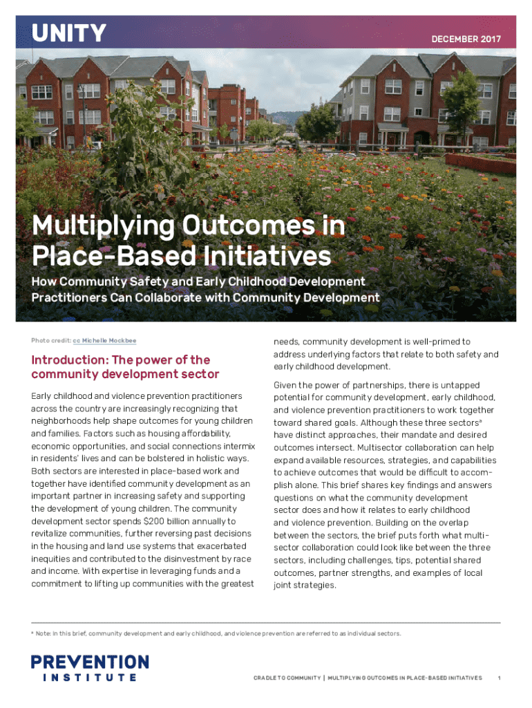 This document highlights the collaboration between community safety, early childhood development practitioners, and community development sectors to enhance outcomes for young children and families in neighborhood settings. It discusses the overlap between these sectors and outlines key findings, methods for collaboration, and the importance of addressing underlying factors affecting safety and development in communities.
