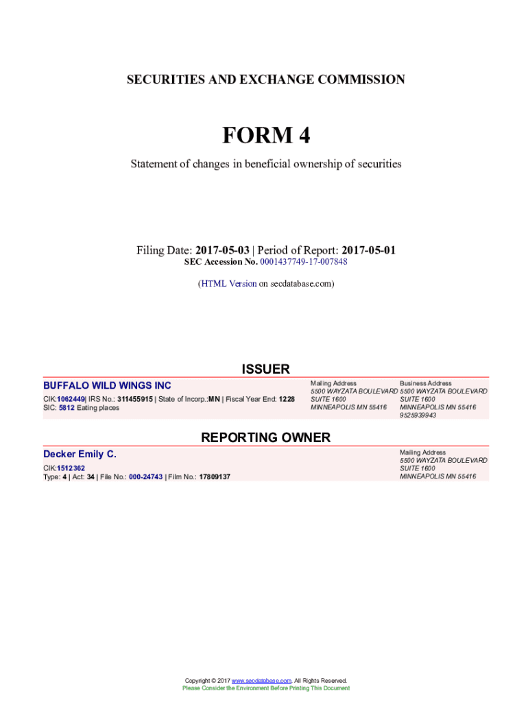 Get the free BUFFALO WILD WINGS INC Form 4 Filed 2017-05-03. Accession Number