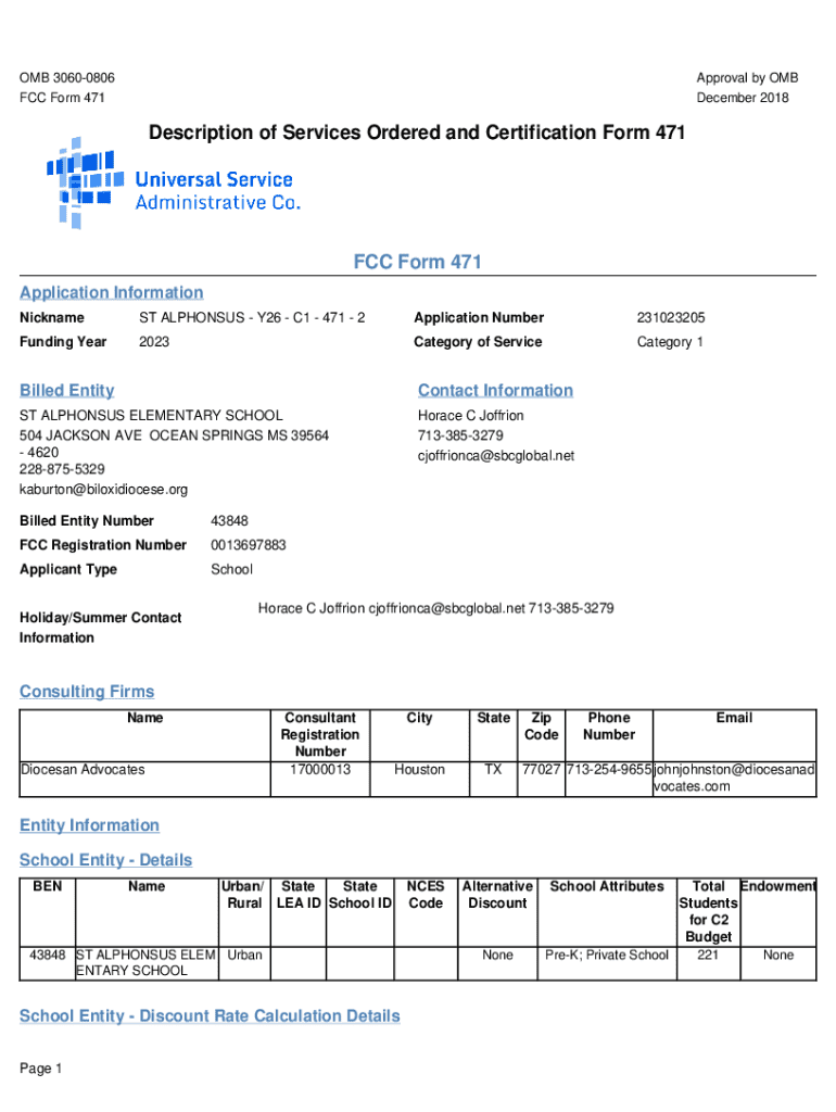 OMB 30600806 FCC Form 471Approval by OMB December 2018Description of Services Ordered and Certification Form 471FCC Form 471 Application Information NicknameST ALPHONSUS Y26 C1 471 2Application Number231023205Funding