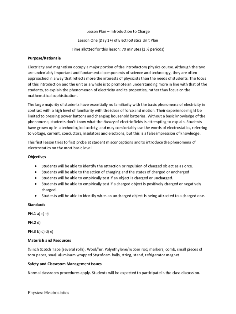 Get the free Sample Unit Plan Electrostatics Unit Plan