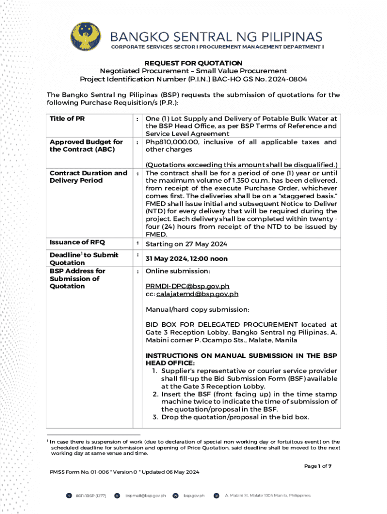 CORPORATE SERVICES SECTOR I PROCUREMENT MANAGEMENT DEPARTMENT IREQUEST FOR QUOTATION Negotiated Procurement Small Value Procurement Project Identification Number (P.I.N.) BACHO GS No. 20240804 The