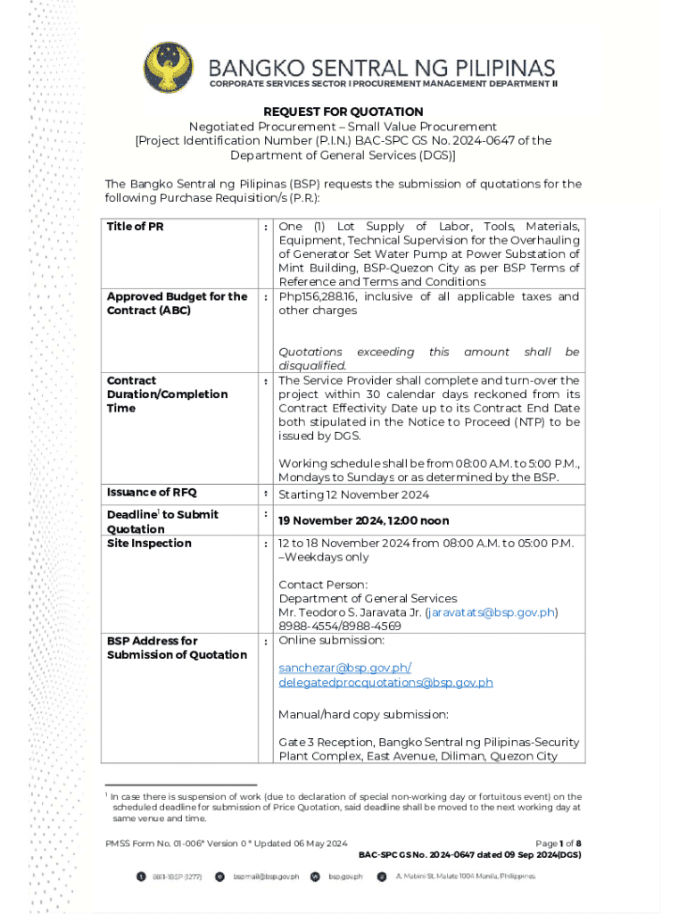This document is a Request for Quotation from the Bangko Sentral ng Pilipinas for the procurement of labor, tools, materials, and technical supervision for the overhauling of a generator set water pump at the BSP Mint Building in Quezon City. The budget for the contract is Php156,288.16, with specific instructions for submission, requirements, timelines, and conditions for bidding. It also outlines the obligations of the service provider, legal requirements, and terms and conditions of the...