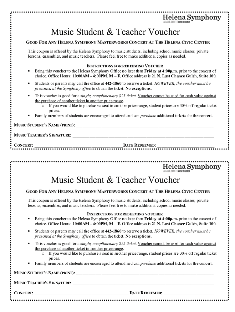 Music Student & Teacher Voucher GOOD FOR ANY HELENA SYMPHONY MASTERWORKS CONCERT AT THE HELENA CIVIC CENTER This coupon is offered by the Helena Symphony to music students, including school music