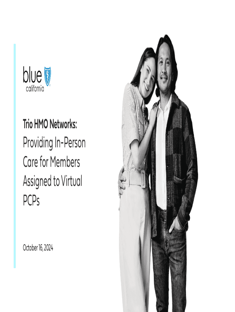 Trio HMO Networks:Providing InPerson Care for Members Assigned to Virtual PCPs October 16, 2024Your Blue Shield presentersNina Birnbaum, MD Medical Director Health Transformation OversightTyler LopezZiemann