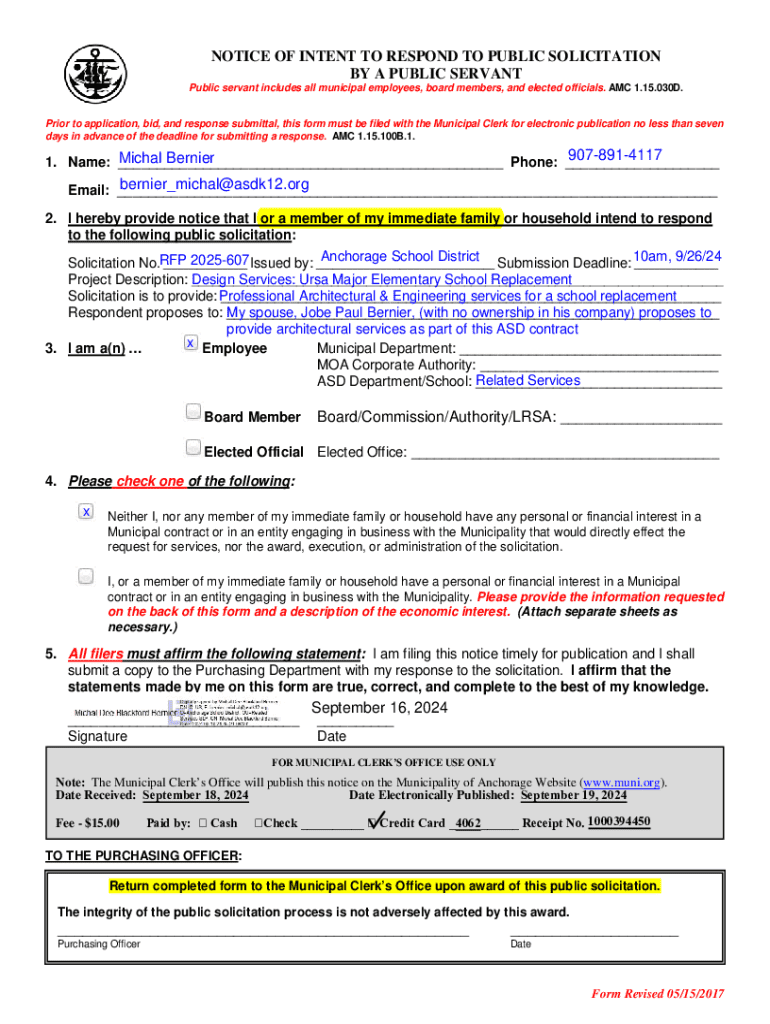 NOTICE OF INTENT TO RESPOND TO PUBLIC SOLICITATION BY A PUBLIC SERVANT Public servant includes all municipal employees, board members, and elected officials. AMC 1.15.030D.Prior to application, bid,