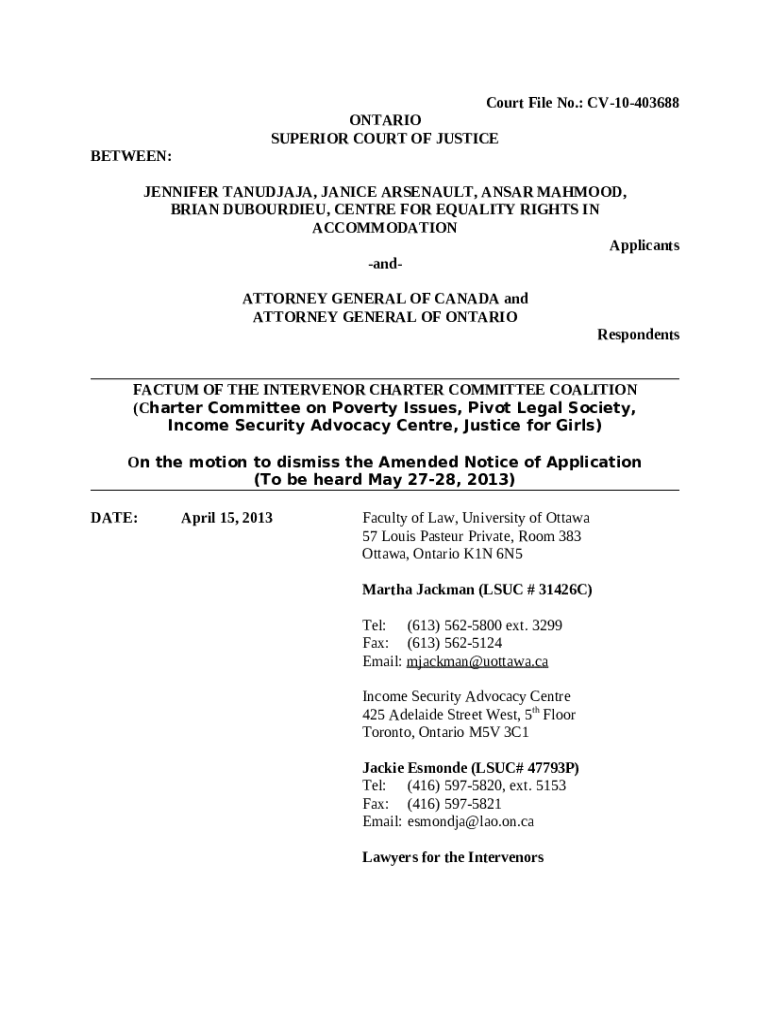 The FACTUM OF THE APPLICANTS (RESPONDENTS ON THE ... is a fillable form in MS Word extension that can be filled-out and signed for specified purpose. Next, it is furnished to the relevant addressee in order to provide some details of certain kinds. The completion and signing may be done or using an appropriate service e. g. PDFfiller. These applications help to send in any PDF or Word file without printing them out. It also lets you edit its appearance depending on your requirements and put a legal digital signature. Once finished, you send the FACTUM OF THE APPLICANTS (RESPONDENTS ON THE ... to the recipient or several of them by email or fax. PDFfiller provides a feature and options that make your document of MS Word extension printable. It has various options for printing out appearance. It doesn't matter how you'll send a form - physically or electronically - it will always look professional and firm. To not to create a new file from the beginning over and over, turn the original file as a template. After that, you will have a customizable sample.