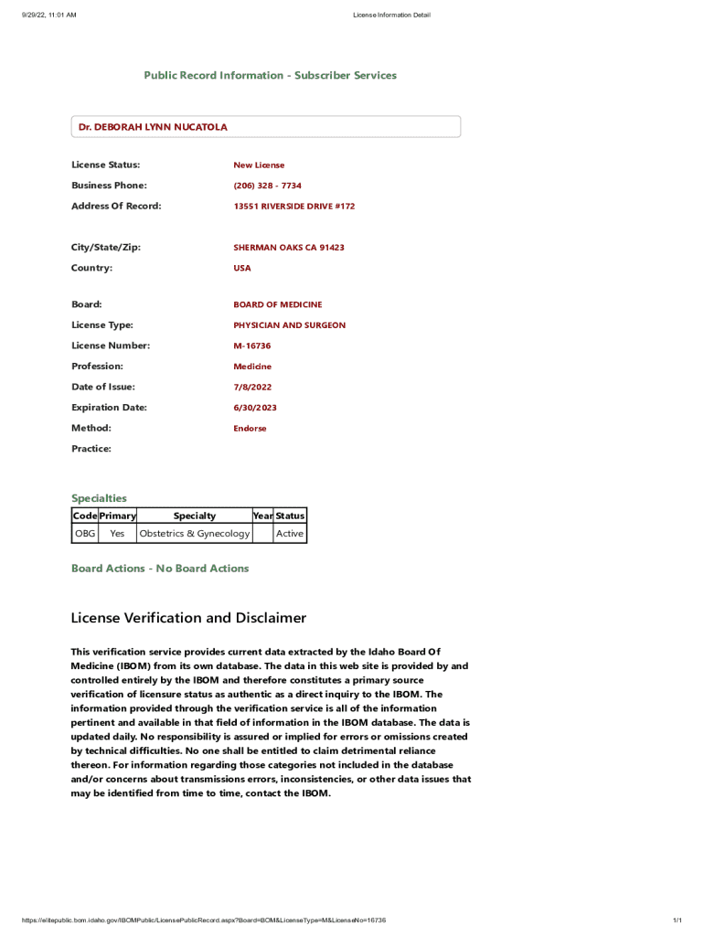 This document provides detailed license information for Dr. Deborah Lynn NuCatola, including her license status, contact information, board affiliations, and professional specialties as a physician and surgeon.