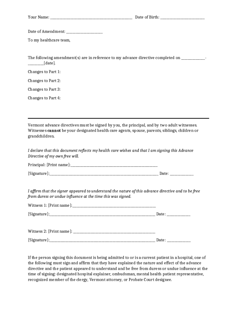 Vermont Advance Directive Amendment template instructions