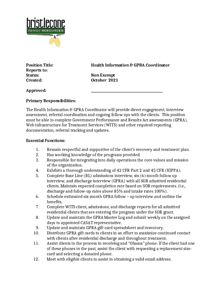 The Health Ination & Gpra Coordinator is a writable document needed to be submitted to the relevant address to provide specific information. It must be filled-out and signed, which is possible manually, or with the help of a certain software such as PDFfiller. This tool allows to complete any PDF or Word document directly in your browser, customize it depending on your purposes and put a legally-binding e-signature. Right away after completion, the user can easily send the Health Ination & Gpra Coordinator to the relevant receiver, or multiple ones via email or fax. The blank is printable as well thanks to PDFfiller feature and options presented for printing out adjustment. Both in electronic and physical appearance, your form will have got organized and professional outlook. It's also possible to turn it into a template for later, without creating a new file again. All you need to do is to edit the ready template.