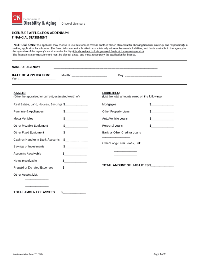 The Licensure Application Addendum Financial Statement is a fillable form in MS Word extension needed to be submitted to the required address to provide some information. It must be filled-out and signed, which can be done in hard copy, or with the help of a certain solution such as PDFfiller. This tool helps to fill out any PDF or Word document directly from your browser (no software requred), customize it according to your needs and put a legally-binding electronic signature. Right away after completion, user can send the Licensure Application Addendum Financial Statement to the appropriate receiver, or multiple ones via email or fax. The blank is printable too due to PDFfiller feature and options offered for printing out adjustment. Both in digital and physical appearance, your form should have a clean and professional appearance. Also you can save it as the template for further use, so you don't need to create a new blank form from the beginning. You need just to customize the ready sample.